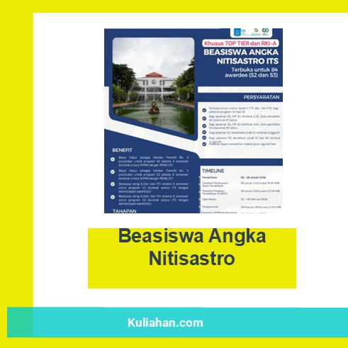 Informasi kali ini dibukanya program Beasiswa Angka Nitisastro Pascasarjana ITS untuk kuliah S2 dan S3. Program beasiswa ini dibuka dan diberikan oleh Pascasarjana ITS dan terbuka untuk umum.