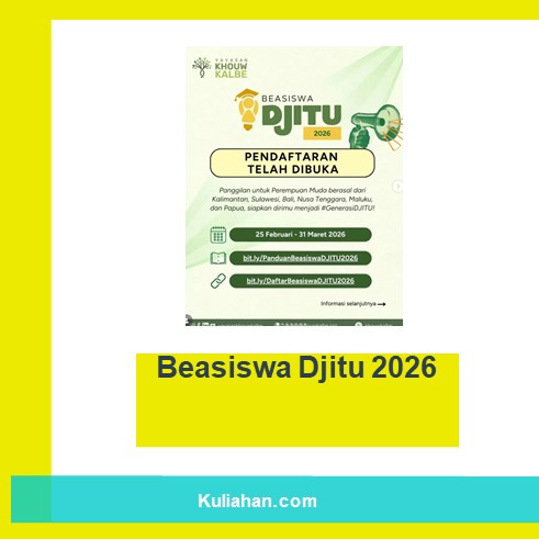 Beasiswa Djitu 2026 sedang dibuka bagi anda Pelajar jenjang SMA SMK Sederajat kelas XII, pelajar gap year 2 tahun dan Mahasiswa jenjang diploma dan Sarjana. Program ini sangat layak anda coba bukan hanya bagi anda yang sudah berkuliah namun anda yang bercita-cita melanjutkan kuliah dan terkendala biaya pendidikan.